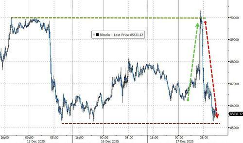 周三比特币曾短暂跳升至9万美元,交易员将其归因于空头头寸的大量清算,但随后迅速恢复跌势。这一原始加密货币回落至10月崩盘以来交易区间的低端,最多下跌2.8%至85278美元。